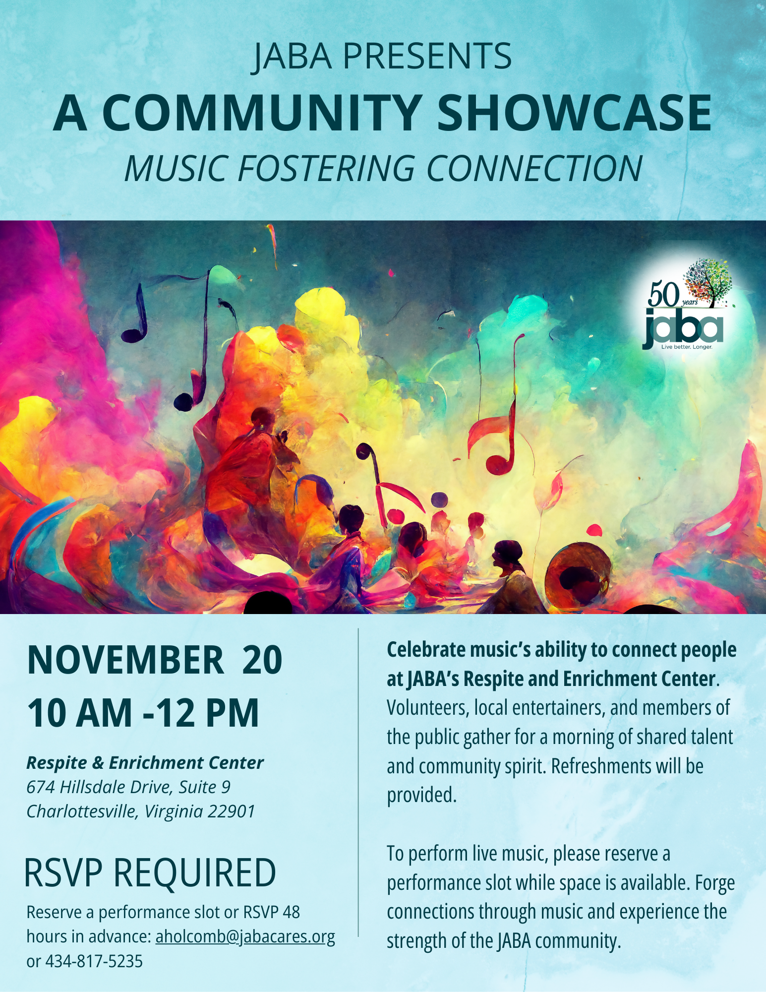 Celebrate music’s ability to connect people at JABA’s Respite and Enrichment Center. Volunteers, local entertainers, and members of the public gather for a morning of shared talent and community spirit. Refreshments will be provided.