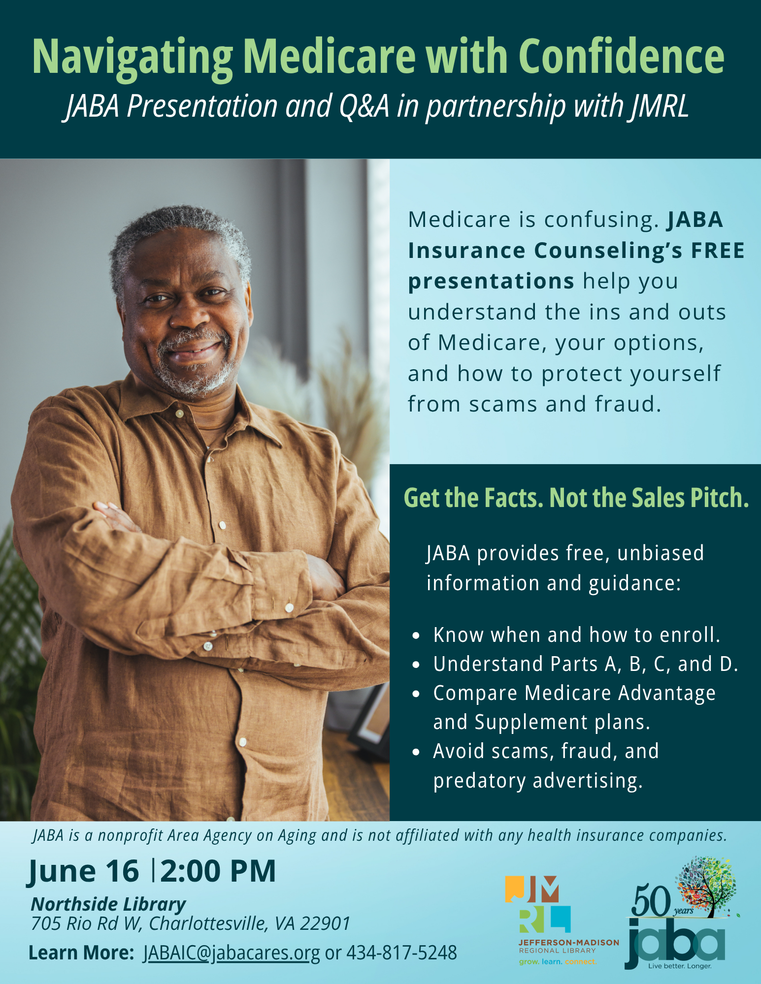 Medicare is confusing. JABA Insurance Counseling’s FREE presentations help you understand the ins and outs of Medicare, your options, and how to protect yourself from scams and fraud.