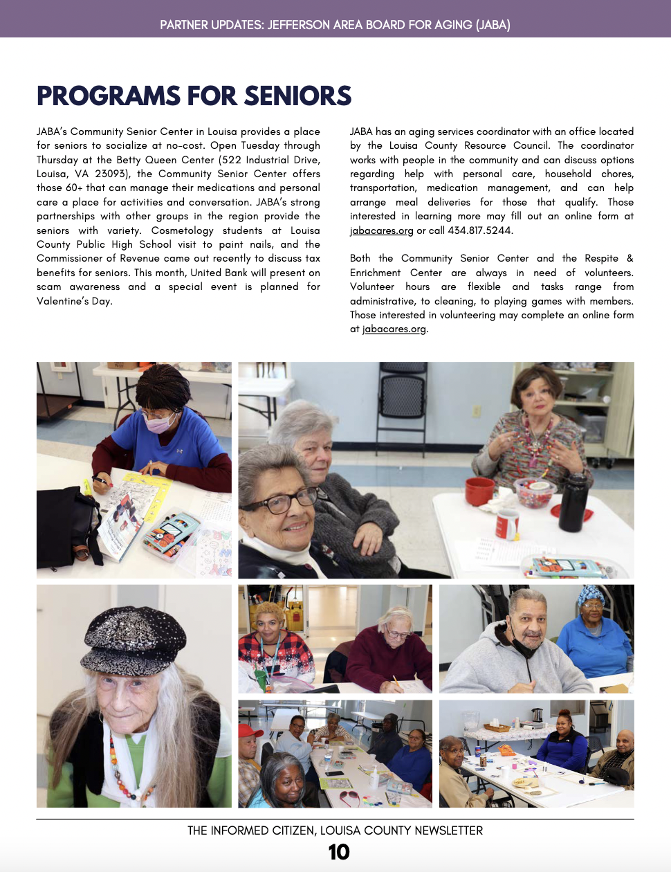 Guest User February 1, 2024 JABA Programs for Adults with Disabilities & Seniors in Louisa Guest User February 1, 2024 From Louisa County’s Informed Citizen Newsletter: View fullsize View fullsize