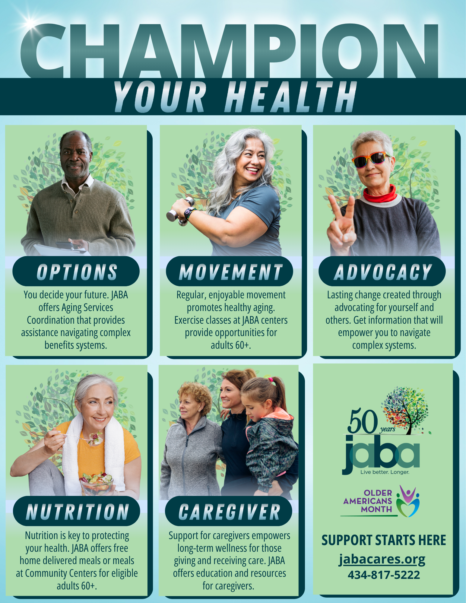 Every May, Older Americans Month shines a spotlight on aging trends and reaffirms our commitment to supporting older adults. This year, we focus on Championing Your Health, encouraging conversations and actions that promote physical, mental, and emotional well-being at every age.